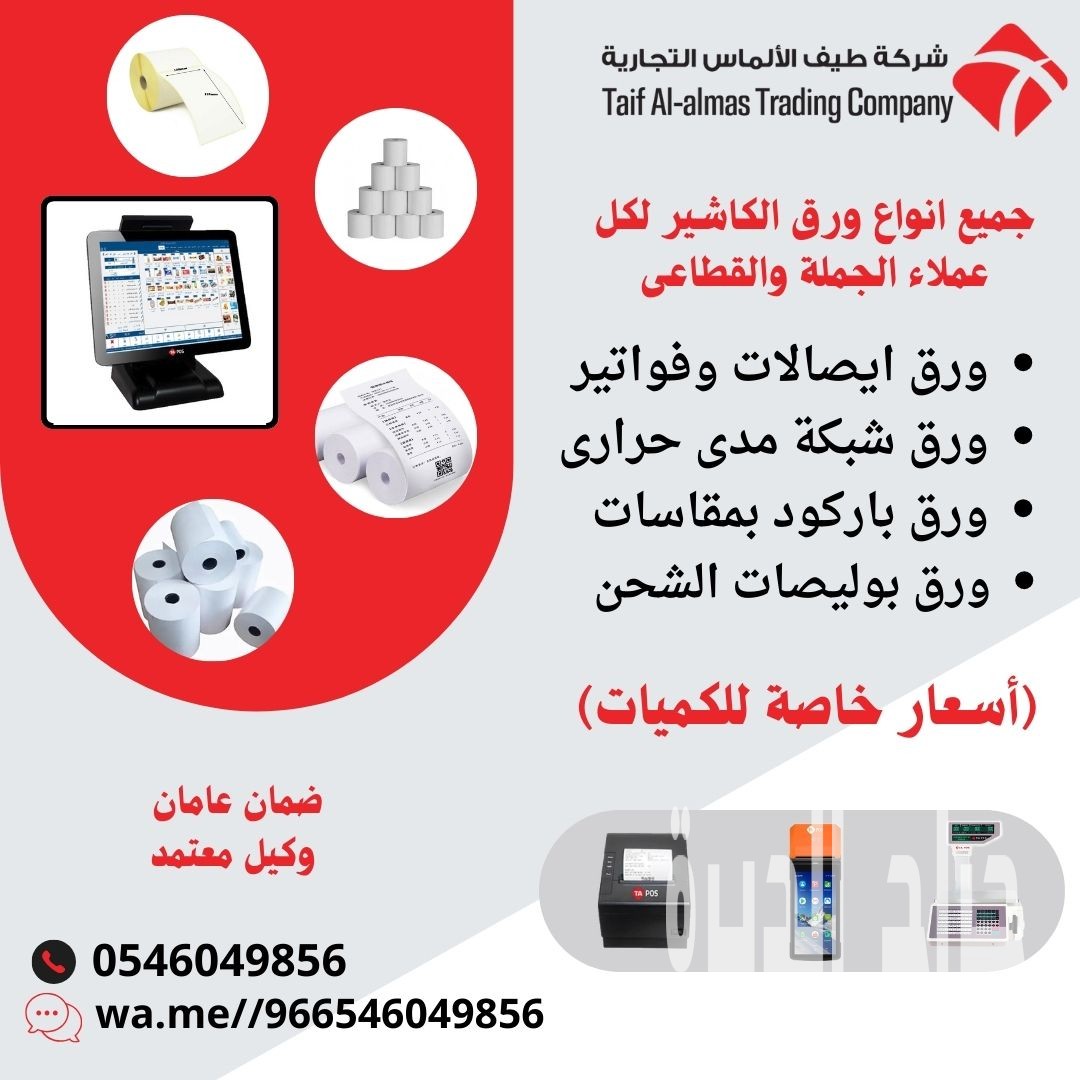 (اقوى التخفيضات على ورق الكاشير ورق الباركود ورق الفواتير ورق مدى بسعر الجملة) (1) ورق الايصالات الحراري للكاشير مقاس 80*70 -الوزن للحبه 65 جرام -طول الرول : 40 متر -الكرتون شد 50 حبه -مقاس الكور بلاستك 13/17mm بمعني الكور بلاستك هوا الجزء المشدود علية الورق مقاسه من الداخل 13 من الخارج 17 (2) ورق شبكة مدي مقاس 57*40 -الكرتون شد 100 حبة (3) لاصق استيكر الباركود مقاس 22*40 -الرول 2000 استيكر (الكارتون 50 رول) (4) لاصق استيكر الباركود مقاس 28*38 -الرول 2000 استيكر (الكارتون 50 رول) (5) لاصق استيكر باركود مقاس 25*50 -الرول 2000 استيكر (الكارتون 50 رول) (6) لاصق استيكر باركود مقاس 60*40 -الرول 1000 -استيكر (الكارتون 50 رول) (5) لاصق استيكر باركود مقاس 150*100 -الرول 500 استيكر (الكارتون 20 رول) (6) لاصق استيكر باركود مقاس 75*100 -الرول 500 استيكر (الكارتون 25 رول) (7) لاصق استيكر باركود مقاس 50*100 -الرول 500 استيكر (الكارتون 25 رول) (6) لاصق استيكر باركود مقاس 50*75 -الرول 500 استيكر (الكارتون 25 رول) ● فروعنا: -الرياض-جده-خميس مشيط-المدينة المنورة-تبوك -ضمان عامان على جميع المنتجات -فريق محترف للتركيب والبرمجة -خدمة دعم فنى بعد البيع ● الجوال :(0546049856) ● واتساب :wa.me//966546049856 #ورق_حراري #ورق_باركود #ورق_طابعات #طابعات_الفواتير #بيع_جملة #بيع_قطاعي #شحن_سريع #ورق_فواتير#جودة_مضمونة #أسعار_تنافسية