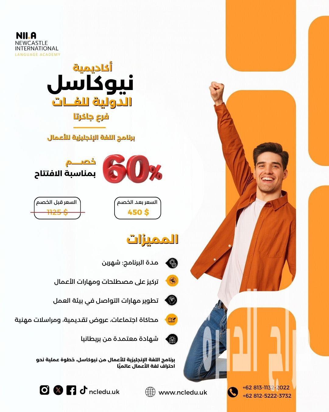 بلوم اللغة الإنجليزية – فرع جاكرتا أكاديمية نيوكاسل الدولية للغات تعلن عن فتح التسجيل في برنامج الدبلوم المكثف 6 أشهر مع عرض خاص وخصم 50% مميزات البرنامج: • دراسة يومية 8 ساعات مكثفة • شهادتين معتمدتين (بريطانيا + إندونيسيا) • سكن + وجبات + تابلت لكل طالب • متابعة مستمرة عبر معلم ذكي يعمل بالذكاء الاصطناعي 24/7 السعر بعد الخصم: 6,600 دولار فقط للتفاصيل الكاملة والملف التعريفي (pdf) يرجى التواصل معنا عبر الواتساب: 6281311322022